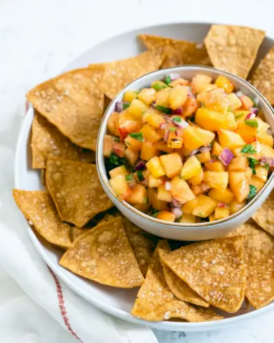 Você já experimentou um molho de pêssego? Se não, você terá uma surpresa! A mistura dos pêssegos doces e suculentos com as cebolas vermelhas picantes não é apenas incrivelmente deliciosa, mas também bastante versátil. Você pode servir com batatas fritas ou biscoitos como aperitivo. É o molho de pêssego perfeito para peixe, ou em burrito ou taco. Com tortilla chips, é um dos nossos acompanhamentos de verão!
