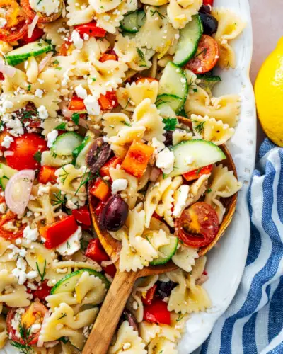 Esta é a nossa escolha quando se trata de acompanhamentos de verão: esta Salada de Macarrão Grega! Este combina sabores de estilo mediterrâneo com massa de gravata borboleta para uma combinação picante e fresca que não pode ser batida. Os suculentos tomates cereja contrastam com o pepino fresco, as azeitonas salgadas e o saboroso queijo feta, com generosos punhados de salsa, endro e um molho vinagrete ao estilo grego.
