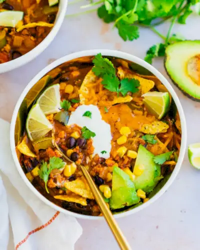 Se você adora tacos e adora sopa… bem, sopa de taco é óbvia! É uma invenção Tex Mex como salada de taco , basicamente um mashup entre um mexicano sopa de tortilha e pimentão americano. Cada tigela é quente, saborosa e esfumaçada, e uma tela aconchegante para coberturas como creme de leite e tortilhas esmagadas. A melhor parte: é feito em 30 minutos e personalizável para comedores de qualquer dieta.