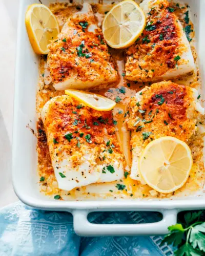 Procurando um jantar caseiro durante a semana? Experimente este incrível Bacalhau Assado! Admitamos que o bacalhau nem sempre foi um peixe no nosso radar. Mas este peixe é verdadeiramente especial. É suave, macio e de sabor amanteigado. A melhor parte? Está nadando em um molho picante de limão e alho que dá vontade de dar outra mordida antes de terminar de mastigar. Este peixe assado sempre faz sucesso com toda a família!