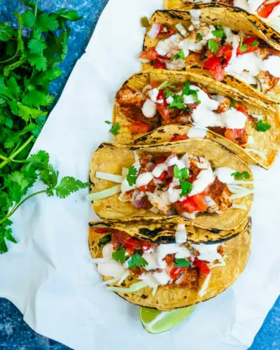 Tem churrasqueira? Experimente estes tacos de peixe grelhado! Eles são impressionantes jantar grelhado isso é cheio de um sabor lindo. Imagine: peixe branco macio e escamoso grelhado com cominho, pimenta em pó e alho em pó. Cubra com o toque de pico de gallo e um molho de taco cremoso e picante, e um pouco de repolho crocante para completar. Empilhado em uma tortilha carbonizada, é tudo o que você deseja que seja uma receita de peixe saudável para o jantar!