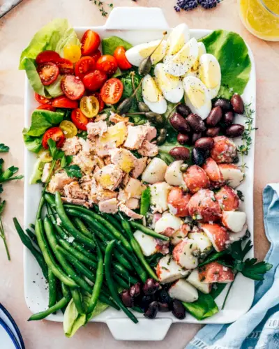 A salada Nicoise é lendária: e por boas razões! Esta clássica salada francesa com funa é um verdadeiro deleite. É uma saúde deslumbrante Dieta mediterrânea almoço ou jantar que você vai querer continuar comendo por dias. Ovos cozidos, feijão verde, azeitonas, tomates, atum e salada de batata picante ficam sobre alface crocante e são cobertos com um molho picante de limão. Use atum em lata da melhor qualidade para este: você não vai se arrepender!