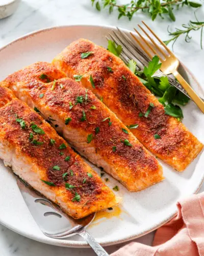 Este salmão cajun enegrecido é tão saboroso que você vai sentir como se tivesse pedido em um restaurante. Melhor ainda: é rápido e fácil. O processo de cozimento leva apenas 5 a 8 minutos! O caseiro Tempero Cajun tem uma intriga picante e saborosa e forma uma crosta preta crocante na parte externa do peixe.