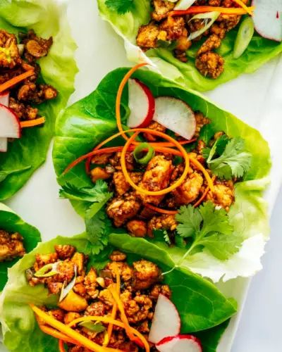 Precisa de uma ideia fresca para o jantar ou de um aperitivo que agrade ao público? Experimente esta receita de wraps de alface! O recheio forte e saboroso é infundido com hoisin, molho de soja e vinagre de arroz, misturando tofu saboroso com castanha de caju e cebolinha. Jogue-o em folhas tenras de alface verde crocante com mais alguns vegetais coloridos e é de morrer!