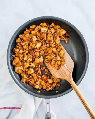 Precisa de um jantar sem carne… rápido? Aqui está um dos nossos atalhos favoritos: esses Crumbles de Tofu rápidos e fáceis! Eles são saborosos, carnudos e o substituto vegetal perfeito que você pode usar de inúmeras maneiras. Se você não é fã de tofu… você será depois de dar uma mordida! (Promessa.) Use-os como recheio de taco, como em Tacos de tofu , ou experimente-os em saladas, massas, refeições em tigela… até mesmo como um saboroso café da manhã! Não há nada que essas migalhas não possam fazer.