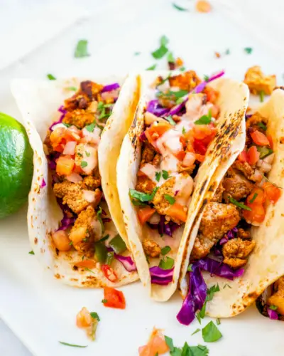 O tofu é ideal em tacos, embora não seja muito usado em receitas de estilo mexicano! Seu sabor neutro assume qualquer sabor que você tempere: e estes tofu esfarelado são um grande truque de cozinha. Adicione cominho, alho em pó, pimenta em pó e páprica defumada e o recheio fica cheio de sabor! Você pode preparar esses tacos fáceis em apenas 20 minutos, tornando-os ideais para refeições durante a semana .