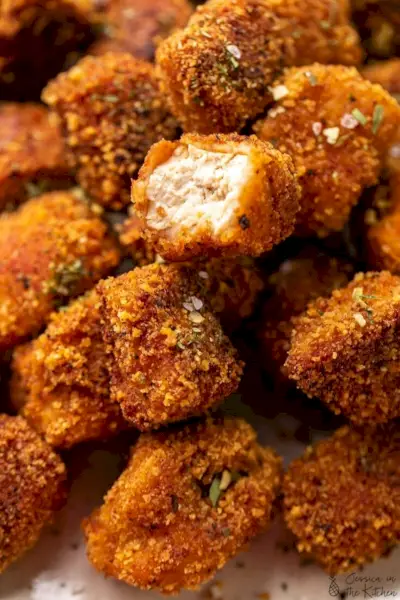 Esses nuggets de frango veganos usam tofu como base e você pode preferi-los aos reais! O exterior é extra crocante e crocante, e o interior é intensamente saboroso. através de Jéssica na Cozinha