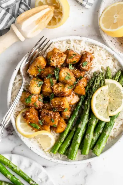 Aqui está uma receita divertida de tofu para apimentar sua rotina de jantar: tofu com pimenta e limão! O tofu crocante e em borracha é servido em um molho doce e cítrico com bastante pimenta-do-reino. É uma refeição saudável e satisfatória. através de Jéssica na Cozinha
