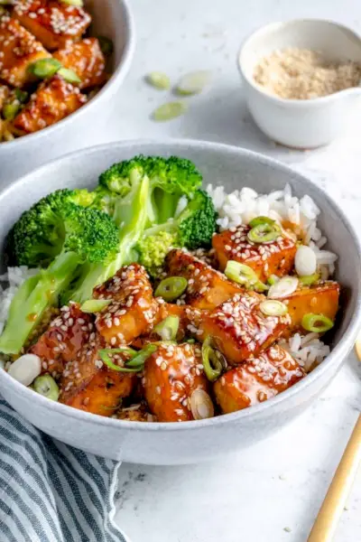 Procurando uma ideia para um jantar de estrela do rock? Experimente esta tigela de tofu crocante! Imagine, pedaços de salgados perfeitamente temperados tofu crocante que são dourados por fora e macios por dentro. Combine isso com arroz fofo e vegetais frescos e cubra com um maionese picante . A melhor parte? Polvilhe tudo com cebola frita crocante! Faz uma tigela que é uma explosão de texturas e sabores - que é totalmente vegetal.