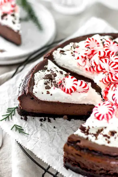Este Cheesecake de Chocolate com Menta é uma sobremesa de Natal elegante feita para impressionar! É recheado com chocolate e repleto de sabor de hortelã-pimenta. Os doces de hortelã por cima dão um visual festivo. Através Bolos De Vovô