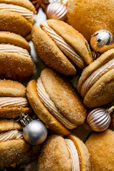 Experimente Snickerdoodle Whoopie Pies para Chrismtas! Eles são uma delícia deliciosa de um biscoito macio e úmido com sabor de canela, recheado com um creme de manteiga de canela batido aveludado. Essa variação do biscoito clássico traz o sabor da canela com a textura de tortas decadentes, parecidas com bolo. através de Britney parte o pão