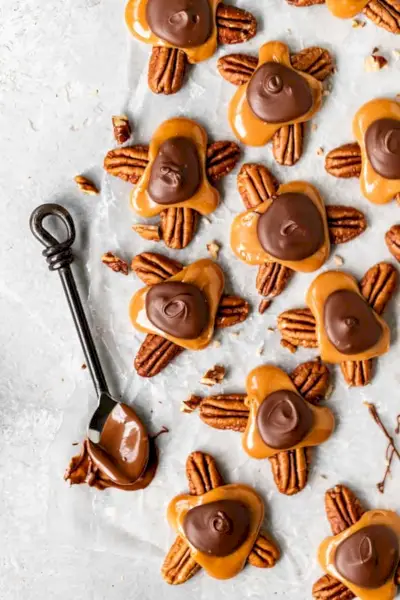 Nenhuma bandeja de sobremesas de Natal está completa sem Tartarugas! Faça esta delícia sem assar em casa: eles têm caramelo rico em borracha, nozes amanteigadas e chocolate ao leite cremoso. O deleite doce e salgado perfeito! Através Bolos De Vovô