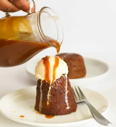 Este pudim de caramelo é embebido e recheado com um glorioso molho de caramelo pegajoso e pegajoso e, em seguida, coberto com uma bola de sorvete de baunilha. Uma sobremesa tradicional de Natal que todos vão adorar! através de Mordidas Imaculadas