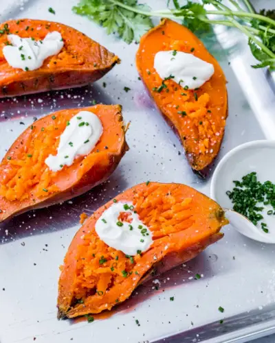 Não há nada melhor do que uma batata doce assada! É fácil, deliciosamente macio e fácil de carregar com coberturas saborosas para transformar em uma refeição. Claro, se você preferir coberturas doces também funciona… ou apenas um pacotinho de manteiga! Esta receita faz batatas perfeitamente macias com uma deliciosa polpa úmida de laranja.