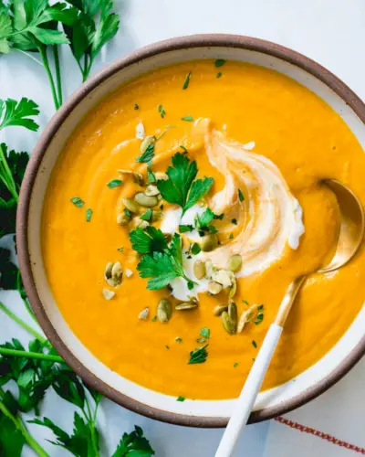 Olá, deliciosa e aveludada sopa de batata doce! Esta raiz vegetal faz o melhor purê doce e cremoso. Acentue-o com uma boa dose de páprica defumada e o sabor fica terroso, sutilmente defumado e absolutamente irresistível. Esta sopa saudável irá agradar a qualquer pessoa: até mesmo aos que odeiam batata-doce!