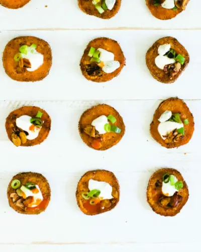 Aqui está uma receita de batata-doce que é a favorita dos fãs há anos. Essas pequenas 'torradas' são temperadas com cominho e pimenta em pó e depois carregadas com queijo, creme de leite e molho picante. O sabor carregado em uma mordida é irreal!