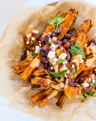 Essas batatas fritas mexicanas são simplesmente batatas-doces assadas cobertas com feijão preto, molho e um creme vegano estilo mexicano feito de tahine e limão (você pode usar o tradicional Creme Mexicano .) As batatas doces e pegajosas contra a cobertura picante são incrivelmente satisfatórias.
