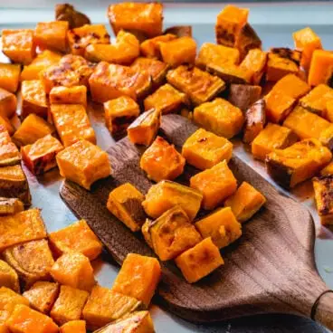 Como fazer a melhor batata doce assada? Corte-os em cubos, tempere com um pouco de alho em pó e sal e leve ao forno alto. Eles ficam macios e caramelizados, os pedaços doces perfeitos.