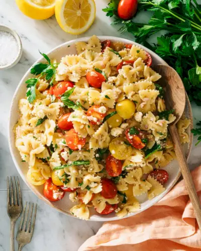 Se há algo de que nunca nos cansamos, é um bom salada de macarrão . Esta salada fácil de macarrão com gravata borboleta se tornou uma das favoritas! Combine o macarrão mastigável com tomates, ervas frescas e queijo feta e, em seguida, misture com um molho vinagrete rápido e fácil. Este fica bem na geladeira por dias!