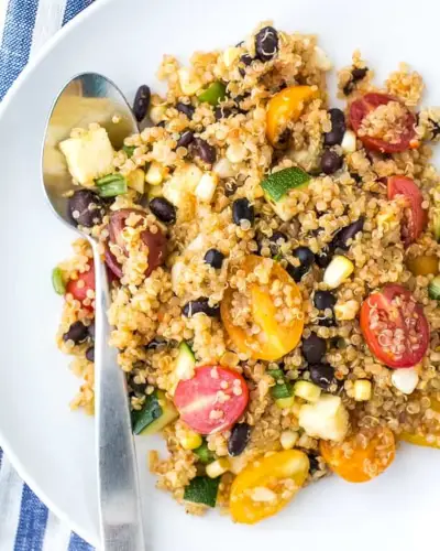Esta receita de quinoa mexicana é uma das poucas ideias de almoço vegetariano nesta lista que requer preparação na noite anterior. MAS, é tão delicioso e divertido que quisemos adicioná-lo à lista: e guarda bem para almoços durante a semana. Aqui, a quinoa é misturada com feijão preto, vegetais e tempero de fajita para criar uma salada super saborosa e farta. É uma daquelas receitas de almoço que você mal pode esperar pela hora do almoço para comer! Outra opção: Salada Caribenha de Feijão Preto