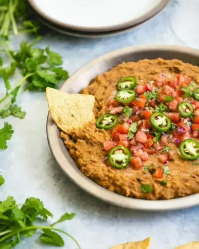 Este aperitivo sem glúten é tão cremoso e irresistível que você ficará surpreso por não haver queijo digno de nota! De alguma forma, é tão satisfatório quanto molho mexicano de queijo , sem as calorias extras. Você pode usar qualquer um Feijão frito instantâneo , feijão frito no fogão , ou feijão frito em lata e misture-os com pimenta verde e cominho. Cubra com salsa fresca e é um toque saudável em um molho de feijão que é muito satisfatório.