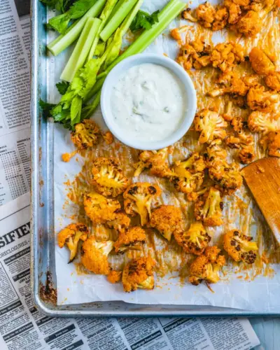 Esta couve-flor de búfalo não tem o menor gosto de sacrifício! Esse aperitivo sem glúten A receita é uma ótima alternativa ao molho de frango de búfala, que é saboroso, mas pode ter alto teor calórico. Simplesmente asse sua couve-flor e espalhe-a com molho de queijo azul: é um lanche saudável com um sabor realmente indulgente.