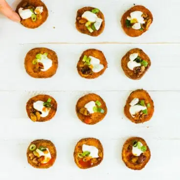 No topo da lista de petiscos sem glúten: Loaded Sweet Potato Bites! Quem precisa de pão quando se pode usar batata doce assada? Essas pequenas 'torradas' são temperadas com cominho e pimenta em pó e depois carregadas com queijo, creme de leite e molho picante. O sabor carregado em uma mordida é irreal! Fazemos isso com frequência e os convidados os devoram rapidamente.