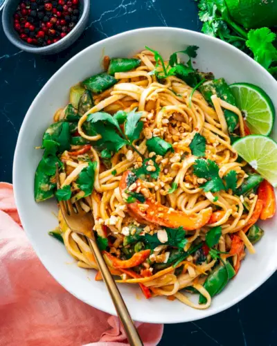 Precisa de inspiração para um jantar vegano? Aconchegue-se com uma tigela desse macarrão de amendoim cremoso e picante! Este é um dos nossos favoritos frescos, jantar fácil receitas e fica pronto em menos de 30 minutos. O molho de manteiga de amendoim é deliciosamente cremoso, repleto de sabores de molho de soja, suco de limão fresco e mel ou xarope de bordo. Misture com deliciosos fios de macarrão e vegetais crocantes e cubra com bastante coentro fresco e amendoim crocante.