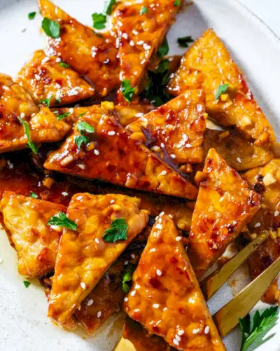 Experimente tempeh marinado! Esta proteína vegana é muitas vezes esquecida, mas tem um sabor enorme quando cozinhada corretamente. Marinar o tempeh confere-lhe um sabor forte e saboroso quando preparado com molho de soja, xarope de bordo, gengibre e alho. Sele rapidamente em uma frigideira e fica com um sabor deliciosamente carnudo, ótimo para servir com arroz ou em uma tigela de refeição.