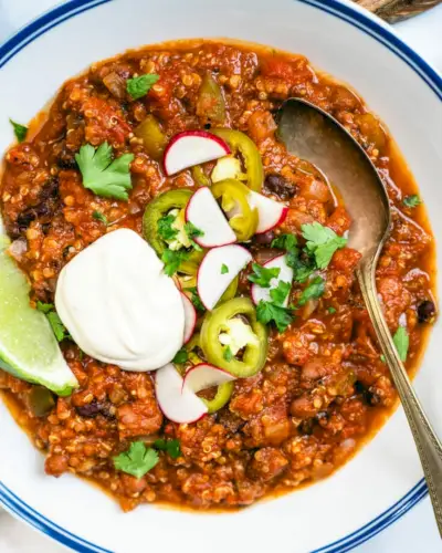 Procurando uma receita de jantar vegana deliciosa e farta? Este chili vegano rápido é para você. Sim, esta é a nossa melhor receita de chili e é totalmente baseada em plantas! É cheio de sabor saboroso, estrelado por feijão, migalhas à base de plantas e um toque de molho de adobo para dar complexidade. Cubra com coberturas vegetais: creme de leite vegano e alguns jalapenos em conserva e está fora deste mundo.