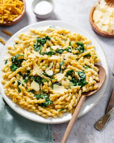Aqui está um formato de massa que conquistou nosso coração: macarrão gemelli! O saca-rolhas exclusivo não só parece bonito, mas suas voltas e reviravoltas são essenciais para manter o sabor dos molhos. Esta é a nossa maneira favorita de servir: coberto com um rico molho de creme de parmesão com alho. O espinafre tenro murcha na mistura, adicionando um toque de cor e uma dose de vegetais.