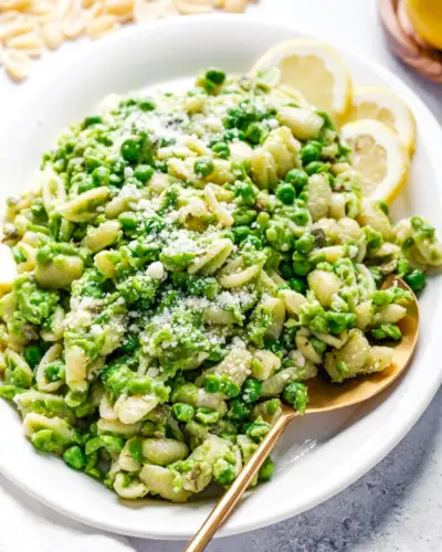 Experimente esta receita linda e brilhante de macarrão com ervilha, pronta em apenas 20 minutos com um punhado de ingredientes! O sabor é fresco, picante e positivamente delicioso. Você vai amassar algumas ervilhas com alcaparras, limão, alho e queijo pecorino para fazer um molho cremoso, depois adicionar mais ervilhas e decorar com mais pecorino.