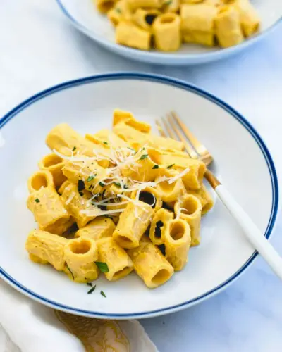 Diga olá à nossa nova forma favorita de comer abóbora: macarrão de abóbora! Purê de abóbora em um molho cremoso com alho, especiarias e queijo de cabra. É saboroso com um tom adocicado, ideal para cobrir massas rigatoni em borracha.