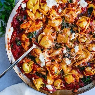 Primeiro em nossas receitas de massas vegetarianas: experimente este tortellini de queijo com molho cremoso marinara! Em apenas 15 minutos, você tem uma frigideira de macarrão que é literalmente sinfonia de sabor. O molho marinara com infusão de manjericão fresco é perfeitamente complementado com almofadas de queijo de cabra picante. Este é um grande sucesso em nossa casa… e esperamos que seja na sua também!