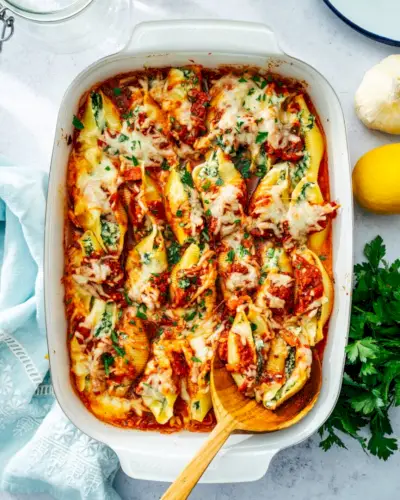 Aqui está uma receita de massa italiana simples, farta e que agrada a todos: Conchas Recheadas! Recheie as cascas de macarrão com ricota, mussarela, parmesão e espinafre e leve ao forno em banho de molho de tomate com alho. Faz com que sua cozinha tenha um cheiro maravilhoso, e a primeira mordida em uma daquelas conchas enormes confirma que é tão saborosa quanto o cheiro.