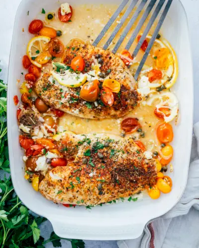Aqui está uma receita que surpreende: esta Tilápia Assada com Tomate e Feta! O peixe tenro e escamoso é coberto com molho de limão e alho, acompanhado de tomate cereja estourado, temperos mediterrâneos e pedaços pegajosos de queijo feta.