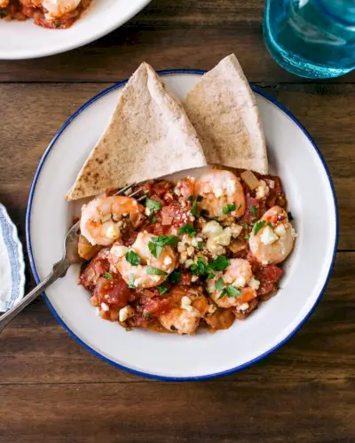 Esta receita de camarão assado é incrivelmente saborosa e fácil de fazer; o camarão é assado em molho de tomate mediterrâneo e polvilhado com queijo feta e salsa.