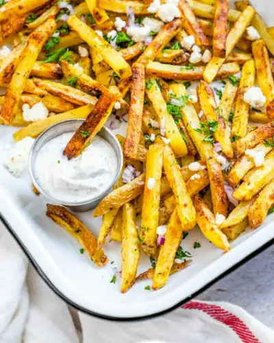Estas batatas fritas gregas crocantes são o melhor acompanhamento! Eles são regados com coberturas de estilo mediterrâneo: queijo feta, cebola e ervas.