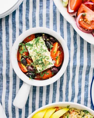 Feta assado com tomate é um aperitivo simples de inspiração grega que fica pronto em menos de 25 minutos. Sirva com pão ou saboreie como está!