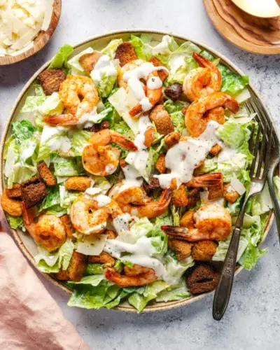 Adicionar camarão salteado para salada César e você tem uma refeição! Esta é uma das nossas formas preferidas de preparar um jantar rápido e fácil. Faça com nosso caseiro Molho César , mas se você estiver com pouco tempo, comprar na loja também funciona!