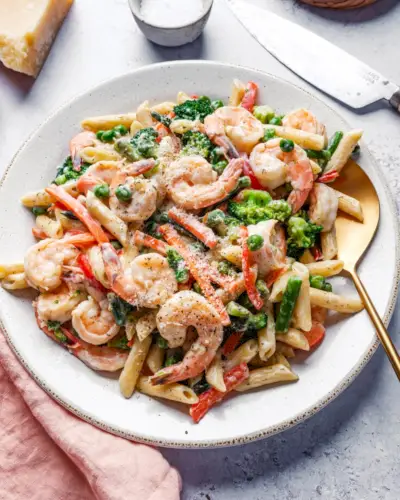 Experimente combinar este suculento marisco com massas e vegetais frescos nesta primavera de camarão. É como um clássico macarrão primavera com camarão adicionado e coberto com um molho leve e cremoso, faz um jantar simples e satisfatório em apenas 30 minutos.
