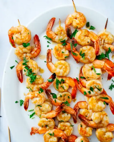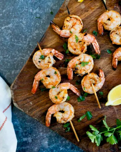 Experimente estes espetos de camarão marinados! Os sabores são ousados, saborosos e penetram na polpa tenra e suculenta de uma forma que um simples tempero não consegue. Misture alguns ingredientes da despensa, sem necessidade de picar. Faça na grelha e eles cozinham em apenas 5 minutos!