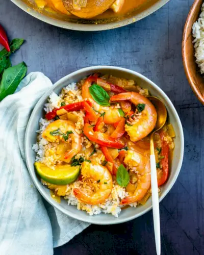 Este curry de camarão tem gosto melhorar do que um restaurante, mas é um jantar rápido e fácil que você pode fazer em casa! Há muito sabor aqui: leite de coco rico, pasta de curry aromática, limão picante e manjericão apimentado envolvendo camarões tenros e suculentos. Sirva arroz de jasmim e seus amigos e familiares cantarão seus louvores.