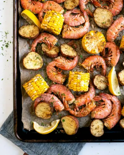 A seguir, em nossas receitas de jantar de camarão: ferva o camarão na assadeira! Por que não aproveitar a magia da fervura do camarão para uma refeição diária? Este camarão cozido no forno é uma maneira fácil de prepará-lo durante a semana: não é necessária panela grande ou fogo! O resultado é uma fervura de frutos do mar cheia de delícias assadas no forno. O camarão é macio e os vegetais ficam dourados e caramelizados, temperados com as nuances do tempero Old Bay.