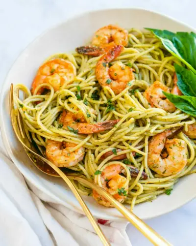 Aqui está uma receita de jantar rápida e fácil que sempre faz sucesso: macarrão com pesto de camarão! Cubra o macarrão longo com pesto de manjericão e adicione camarões suculentos e suculentos. Acontece que o pesto com alho é o par perfeito para o saboroso camarão. Funciona tão bem para um jantar quanto para uma refeição durante a semana.