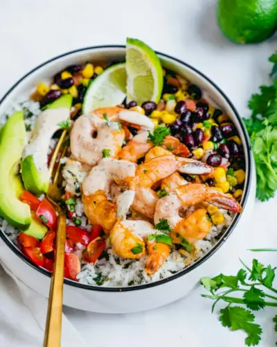 Aqui está uma receita irresistível de camarão que você vai querer fazer sempre… esta tigela de arroz com camarão! Recebeu 5 estrelas em nossa casa. Misture um lote de arroz de coentro e limão e cubra com camarão tenro e salada de feijão preto e milho. Esta melhor parte é cremosa e picante molho rancho chipotle que cobre tudo em delícia .