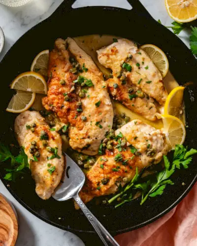 Aqui está um prato clássico que sempre impressiona: piccata de frango! Costeletas de frango tenras e marrom-douradas são banhadas em um vibrante molho de manteiga de limão com toques de alcaparras salgadas. Este prato clássico ítalo-americano conquistou corações e estômagos em todo o mundo e é um grande favorito por aqui. Não se deixe intimidar pelo seu nome chique; esta receita de frango piccata é surpreendentemente simples de fazer em casa!