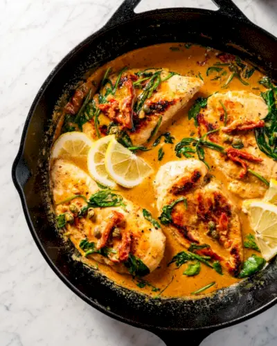 Se pudéssemos comer apenas um jantar para o resto de nossas vidas, poderia ser este: uma frigideira de frango cremoso da Toscana! O que é que o torna tão escandalosamente bom? Talvez seja o molho sonhador de tomate seco ao sol, espinafre, alho e parmesão, ou a saborosa explosão de sabor do peito de frango grelhado na frigideira. De qualquer forma, é além de delicioso, você pode prepará-lo em 30 minutos e vai agradar a todos. Prepare-se para o jantar de frango dos seus sonhos!