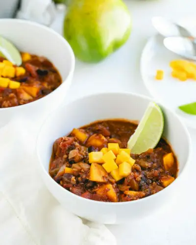 Esta receita de manga e chili é algo totalmente diferente: uma variação inesperada do padrão! Pedaços de manga fresca adicionam uma doçura sutil e há um toque de pimenta da Jamaica para um pouco de complexidade. Um pouco de limão leva este chili vegetariano por cima.