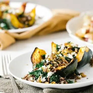 Esta abóbora assada é cozida até ficar macia e doce e coberta com recheio de arroz selvagem com pistache e queijo feta. É perfeito para entretenimento!
